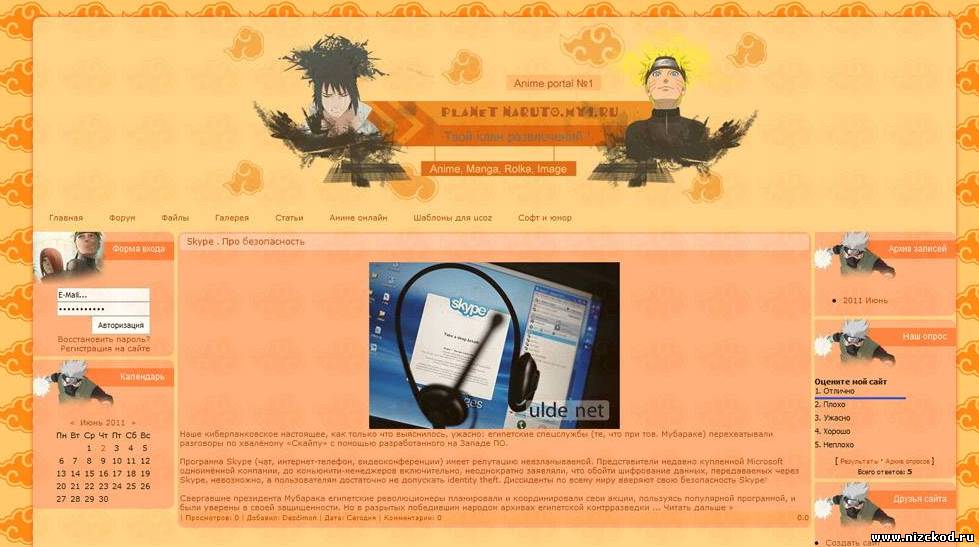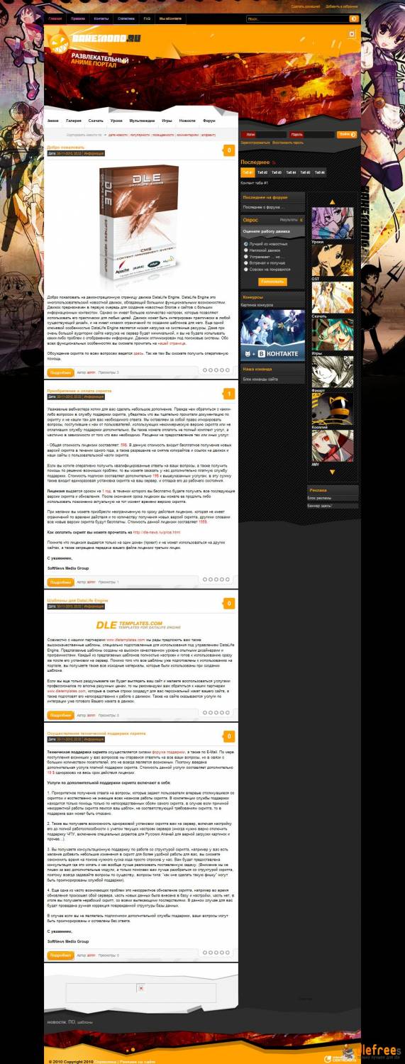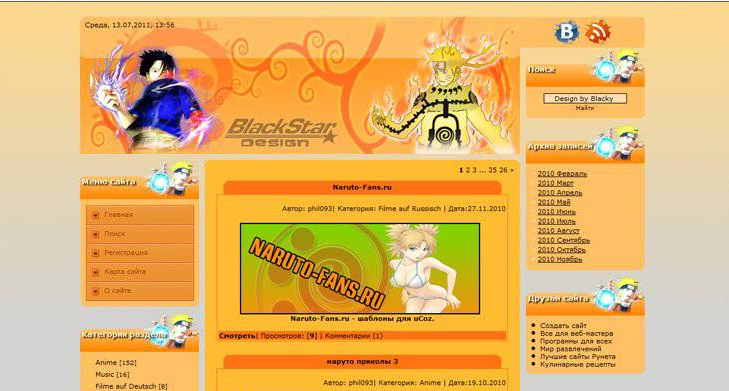 Шаблон сделан специально для фан-порталов Naruto выполнен в желтых тонах с 3-х колоночной структурой ширина фиксированная. Вес шаблона очень маленький и благодаря этому нет никаких нагрузок на ваш сайт . Жёлтый и оранжевые цвета очень сочетаются между собой и благодоря этому вам покажется лето на вашем сайте . Левая боковая панель на много отличается от правой высотой , что и даёт неповторимо-красивый дизайн сайта . В правой колонке есть красивое меню , к нему можно элементарно добавить дополнительные функции для каких либо навигаций , чуть ниже категории разделов . В шаблоне ничего сложного как вы видите нет , но всё же он красив и если вы собрались делать сайт о японских мультфильмах, тогда он для вас . Установка элементарная , просто залить файлы себе на сайт в файловый менеджер и установить скрипт в конструкторе шаблонов , и всё будет работать как по маслу . Скачивайте архив и начинайте наполнять сайт своими идеями и файлами .
