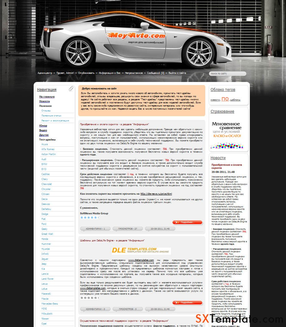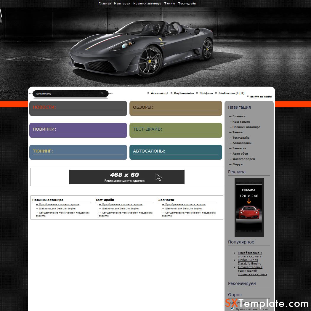 Шаблон для сайтов Ucoz автомобильной тематики с различными модификациями. В целом данный шаблон выполнен на высоком уровне. Красивый логотип сайта неплохо подойдёт для тест драйвов или просто разных машинах как блог. Сама основа шаблона находится как бы в середине сайта, а по бокам просто джинсовый цвет. В шаблоне уже есть вертикальное меню навигации, вертикальное место под рекламу и место под популярные или новые новости об автомобилях, это всё в правом контейнере, сама же основная часть его имеет места под информеры популярного, новостей и т.д., короче говоря есть всё под ваши удобства, рядом есть место под горизонтальный баннер размером 468x60 или под ротатор баннеров. Всё просчитано до мелочей, если вас интересует шаблон автомобильной тематики, то скачивайте бесплатно его и можете, если боитесь проверять его на своём сайте, то создайте пробный сайт и туда установите, а потом можете уже и на свой, дополнительный сайт для проверки шаблонов и скриптов всегда нужен, создайте его и там экспериментируйте всё, что собираетесь устанавливать себе. Приятного вам сайтостроительства и побольше активных пользователей. Кстати, если хотите всегда скачивать бесплатно, то можете добавить нас в закладки, мы будем рады этому, так же как и вы нашим бесплатным файлам.