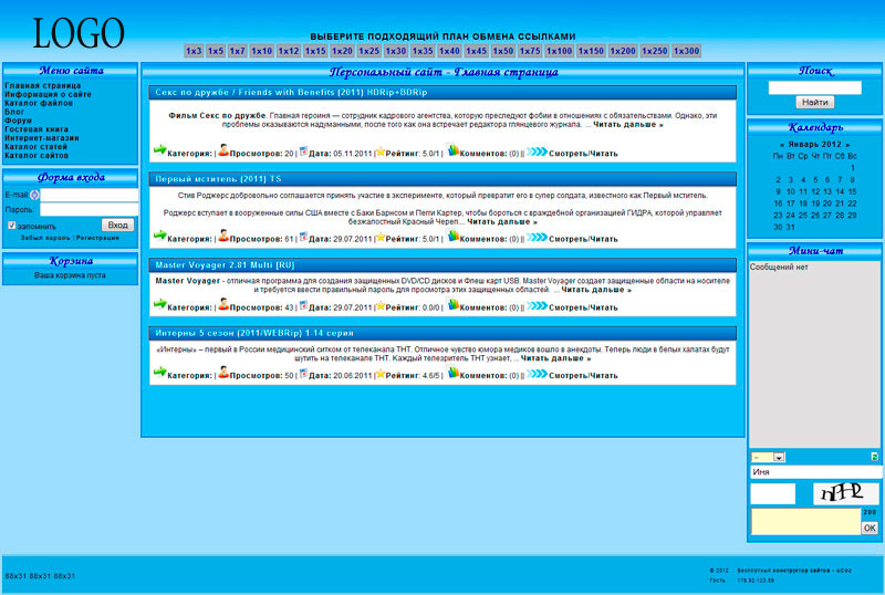Этот красивый голубой шаблон подойдет для сайтов обмена ссылками, только вот что нужно, так это подключение платной услуги PHP. Шаблон этот не проверяли на работоспособность, но можете скачать его и посмотреть что там, да как, вроде всё есть, только ради одной проверки не хочется пользоваться услугой PHP, как подключим, обязательно проверим его и оценим. Если у вас включена эта услуга, тогда скачайте его и проверьте, в случае не работоспособности вы всё равно не потеряете свои деньги. Обмен ссылками нужен для того, чтобы раскручивать разные сайты и путём посещаемости вашего сайта вы и будете зарабатывать. Скачивайте бесплатно шаблон обмена ссылками или скрипт, как его проще назвать и просмотрите его, если вы опытный в этом деле мастер, то сразу узнаете рабочий он или нет. А если у вас денег девать не куда, то можете и PHP подключить и проверить. Если всё работает, то хорошо. Посмотрите ещё дополнительные скрипты, которые тоже могут вам помочь в создании вашего сайта.
