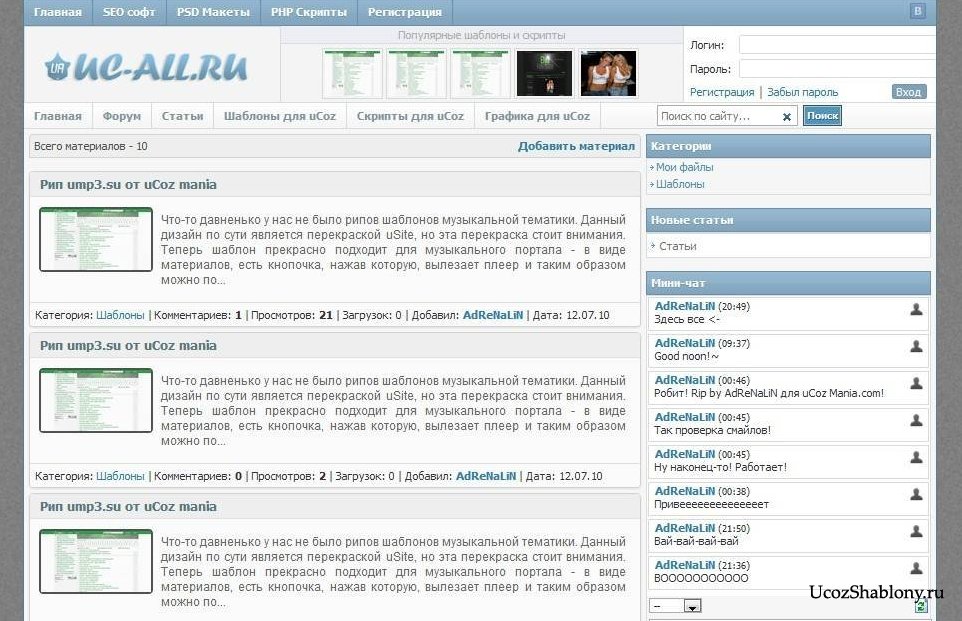 Шаблон с простым светлым дизайном подойдет для сайтов любых типов. Верх сайта очень обширный, в нём размещены два горизонтальных меню, между ними логотип, информер популярных файлов и рядом форма входа с мини-профилем + форма поиска по сайту. Большой и вместительный правый боковой контейнер под категории разделов, информер статей и широкий мини-чат. Главную страницу можно заполнить информерами и виджетами. Не сильно яркий, светлый дизайн этого шаблона будет идеален для создания вашего сайта о любой тематике, какая только вам придёт в голову. Создавайте свой сайт, наполняйте статьями и файлами и потихоньку начинайте продвигать свой красивый сайт в поисковых системах, у вас обязательно всё получится, раз вы стали заниматься созданием сайтов. Скачивайте архив, устанавливайте себе на сайт и всё. Будут вопросы по установкам данного шаблона, обращайтесь с ними на нашем форуме, мы постараемся быстро вам ответить, так же пишите на форуме, если вдруг найдёте у нас ошибку в разделе "Вопросы и ответы по Ucoz".