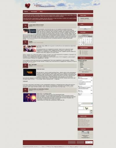 Дизайн 3 apple-светло-красный тематический новостной шаблон для Ucoz с вишенками и облаками в шапке сайта. Один правый боковой контейнер под вертикальное меню, форму поиска, мини-чат, различные виды формы опросов и всё что вашей душе угодно. Шаблон этот не сильно нагружен картинками, то есть не нагружает ваш сайт, даже если у пользователя очень низкая интернет скорость. Главную страницу можно заполнить информером новых новостей и текстом приветствия, для этого даже есть в верху рамка вишнёвого цвета. Нижнюю часть шаблона можете заставить всякими счётчиками статистики посещаемости и кнопками рейтингов каталогов сайтов. На главной странице этого шаблона, главное больше изображений и новостей, чтоб придать ей приличный вид. Наверное и всё, что требовалось рассказать об этом новостном шаблоне, Скачивайте архив и устанавливайте шаблон себе в конструктор ucoz, создавайте свой новостной сайт вишнёвого цвета и наполняйте новостями, файлами и интересными видео-роликами, надеемся что вашим посетителям понравится ваш сайт и они займутся чтением ваших новостей вплотную, смотря что за новости, постарайтесь печатать их правдивые и более интересные, чтоб было интересней их читать.