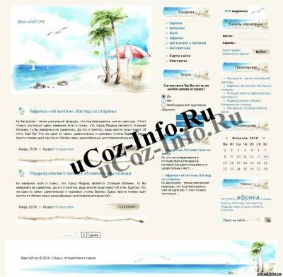Шаблон о туризме, путешествиях и курортах в светлых очень нежных тонах подойдет для вашего сайта, если же вы собрались делать такой. Его можно оформить под свои нужды, можете создать сайт магазин о продажах путёвок или всяких таких услугах. Два правых контейнера сделаны идеально, в них можно разместить всё, что вам будет нужно, а именно продажи, услуги, туризм и всё, что с этим связано. Логотип сайта очень красив, с рисунком голубого моря и пальмами на лазурном берегу не дадут покоя вашим посетителям, им точно захочется отдохнуть и съездить куда либо на курорт, для этого вам и придётся установить такой замечательный шаблон в конструктор Ucoz, Главную страницу вашего сайта заполните всем, что вы предоставляете вашим посетителям, информером новых статей и новостей, а так же красочными изображениями яхт, пляжей и т.д. Нижняя часть шаблона тоже сделана под светлый песок, пальмы,лазурный берег, короче говоря всё что нужно для отдыха вашим посетителям. Скачивайте бесплатно этот изящный шаблон и занимайтесь своими предоставлениями услуг в сфере курортного бизнеса. Приятного вам настроения и отличного отдыха благодаря вашему чудесному интернет-проекту.
