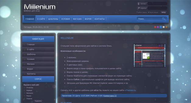 Очень красивый шаблон Concept O2 Ultimate с отличной цветовой гаммой . Изображение грозовых туч придают свой эффект. Красивая большая рамка под логотип сайта и рядом передвижной слайдер под любые темы, какие вы пожелаете . По центру всегда, на каждой странице сайта будет находиться рекламный баннер 468x60 , который вы установите сами , также в том же месте можно установить целый ротатор баннеров , о ротаторе : в него можно устанавливать неограниченное количество любых реклам , которые вы знаете , ну кто о нём знает , тому всё это под силу . Широкий правый боковой контейнер можно заполнить любой информацией , которая вам нужна больше на сайте , в этом контейнере есть переключатель между меню и разделами , очень полезная вешь , чтобы пользователи смогли с лёгкостью найти то , что их интересует , чуть выше красивая форма поиска по сайту и ничего лишнего , если нравится , то скачивайте его и устанавливайте себе , посмотрите и разберитесь в этом шаблоне , если не нравится , то всегда можно вернуть стандартный вид шаблона .