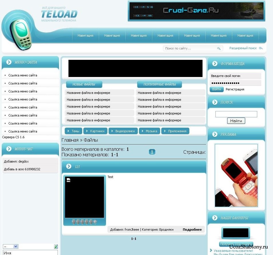 Шаблон со светлым дизайном, цветом морской волны предназначен прежде всего под сотовую - мобильную тематику. И его можно использовать под сайты, чья тематика связанна с мобильными устройствами. Верхняя часть шаблона сделана идеально, логотип шаблона сайта в виде небольшого мобильного телефона очень красив, он связывается с замечательным горизонтальным меню и благодоря этому имеет своё превосходство. Также в самом верху шапки сайта есть красивая рамка под баннерную рекламу размером 468x60, так же в эту рамку можно установить целую ротацию баннеров такого же размера, чуть ниже меню есть небольшая светлая форма поиска по сайту. Левый боковой контейнер шаблона создан под вертикальное меню навигации и отличный мини-чат, Правый боковой контейнер сделан под форму входа на сайт, баннерную рекламу и счётчики статистики посещаемости сайта. Главная страница сайта выполнена просто замечательно, есть красивая белая рамка под горизонтальный баннер или целую ротацию, чуть ниже устанавливаются два информера под новые и популярные сотовые-мобильные файлы которые будут показывать то, что вы добавляете на сайт, ниже вы можете установить видео или изображения телефонов, для этого есть специальные рамки с количеством отзывов. Скачивайте архив шаблона и делайте из него замечательный сайт о мобильных-сотовых телефонах, посетители будут рады видеть такой элегантный дизайн, и им захочется посещать ваш сайт всё снова и снова.