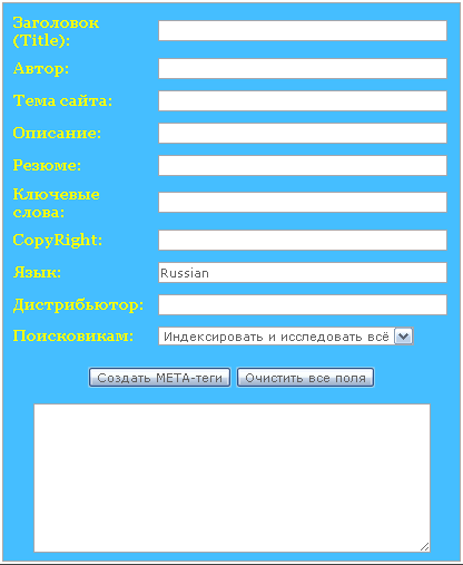 Скрипт таблицы мета-тегов для ucoz голубоватого цвета, отлично подойдёт для оптимизатора , суть генератора скрипта работает так , вы вводите название сайта , либо какой нибудь страницы , вводите описание сайта или страницы и ключевые слова , нажимаете - сгенерировать и сразу в большом окошке получаете код всего того , что нужно для оптимизации под поисковые системы , генерировать и размещать коды надо на каждой странице вашего сайта , для более лучшей оптимизации , благодаря этому скрипту вам не придётся обращаться во всякие компании для раскруток , оптимизации и продвижения сайтов , вы и сами сможете сделать это , как устанавливать полученный код , почитайте в интернете , напишите в любом поисковике "Куда ставить мета-теги" и сразу появятся нужные вам ответы , это не сложно, если вы знаете хоть немного язык html , а если вы профессионал в этом деле , тогда и писать в интернете ничего не надо , код вставляется между <head> и </head>, научиться этому не сложно, скачивайте и пользуйтесь на здоровье.