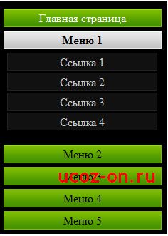 Уникальное раздвижное меню для Ucoz ярко салатового цвета, неплохо будет смотреться на ваших страницах сайта. Скрипт прост в установке и не составит с ней особого труда. Если у вас чёрно-зелёный цвет , то это меню для вас. Скачивайте архив , там есть несложная инструкция, которая поможет установить этот скрипт вертикального меню. Оно только для страниц , или для сайтов с широкими боковыми контейнерами и ни как не для узких, если хотите в блок установить, то выберите сначала шаблон с широкими боковыми блоками, а потом в один из них вставить код из архива , который вы скачали. И тогда это раздвижное меню буде всегда находиться с боку, где бы пользователь не находился на сайте.